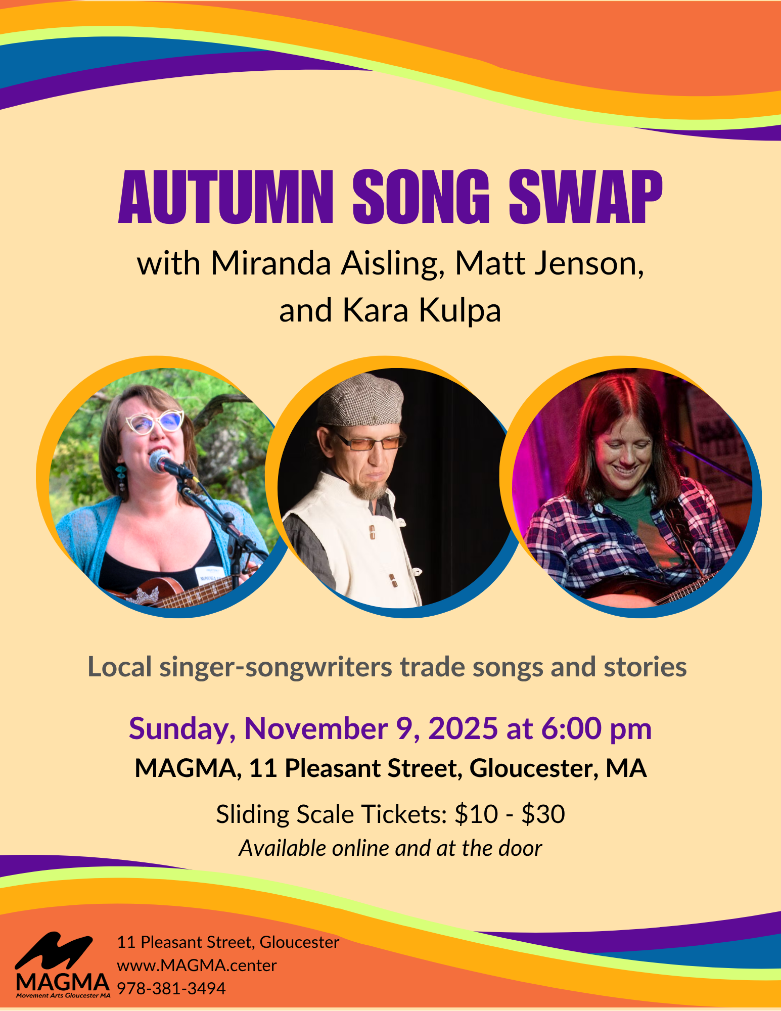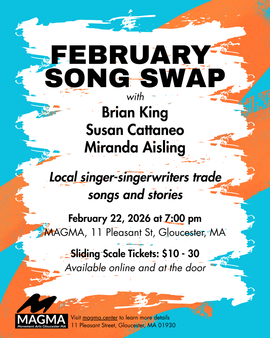 MAGMA 11 Pleasant Street, GloucesterLocal singer-songwriters Brian King, Susan Cattaneo, and Miranda Aisling are coming together at MAGMA to trade songs and stories. Join them on Sunday, February 22, 2026 at 7:00 pm. Tickets are available on a sliding scale from $10 – 30 both online and at the door, ensuring everyone has access to this community event. All …